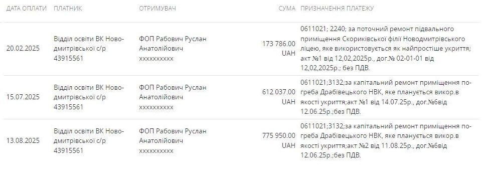 Примітка: Перша платіжка доводить те, що підрядник Рабович регулярно та "плідно" співпрацює з Відділом освіти Новодмитрівської ОТГ, а інші дві, то суми, які вони вже перерахували на його рахунки за погріб у Драбівцях.