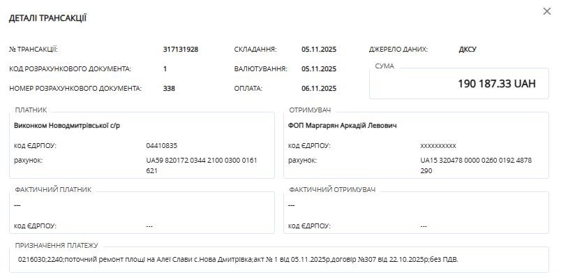 Також 190 187 грн отримав ФОП Маргарян Аркадій Левович за поточний ремонт площі на Алеї Слави с. Нова Дмитрівка. Справа, звісно потрібна, але обсяги угоду знову підігнали під допорогові, щоб не проводити аукціон. Чи достатньо вони зробили на ці кошти, вирішуйте самі. На наше глибоке переконання, такі як Назаренко, обсяги підганяють під допорогові з однією єдиною метою, самі знаєте якою, повторюватись не будемо.