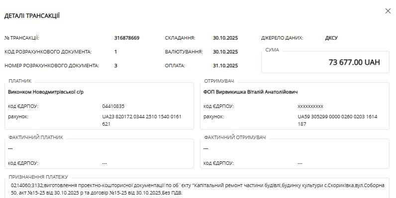 73 тис. грн. ваших бюджетних грошей отримав ФОП Вирвикишка Віталій Анатолійович за виготовлення проектно-кошторисної документації по об`єкту "Капітальний ремонт частини будівлі, будинку культури с.Скориківка, вул.Соборна 50. Багато це чи мало, вирішуйте самі.