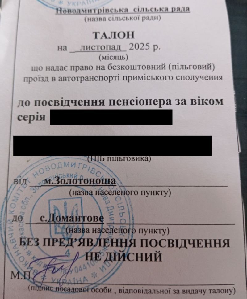 Талон має ось такий вигляд (фото нижче). Він містить підпис того хто видав, номер пенсійного того хто отримав і прізвище пільговика.