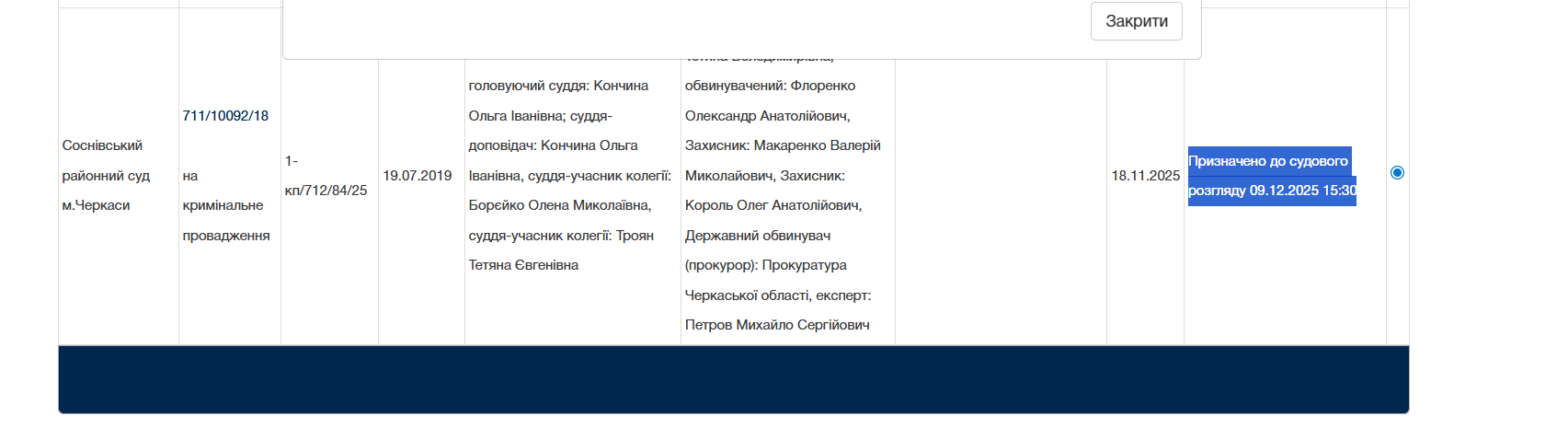 В реєстрах ми бачимо, як члени угрупування, щосили, намагаються затягувати процес, то в них свідок не ходить на засідання без поважної причини, то суд дає санкції на те, що його притягнули туди у примусовому порядку (супровід) тощо. Іншими словами, процес триває. Засідання були в Соснівському суді м. Черкаси 16.04.2025 року.