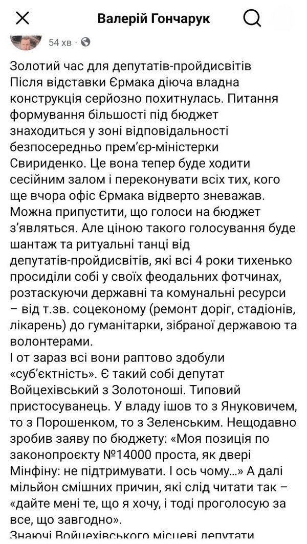 «Після звільнення Єрмака діюча владна конструкція серйозно похитнулась. Питання формування більшості під бюджет знаходиться у зоні відповідальності безпосередньо премʼєр-міністерки Свириденко. Це вона тепер буде ходити сесійним залом і переконувати всіх тих, кого ще вчора офіс Єрмака відверто зневажав.