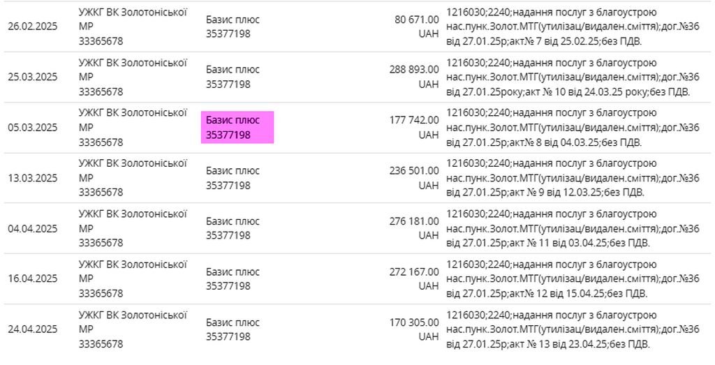 Ще у Золотоноші також є Базис плюс, там де сидить підконтрольна Флоренку Козлова. Так ось, сюди перекачують просто захмарні суми ваших податків. За 2025 рік, станом на зараз, ми через систему контролю за публічними фінансами, нарахували близько 7 000 000 грн. Фото деяких трансакцій, які відбуваються регулярно.