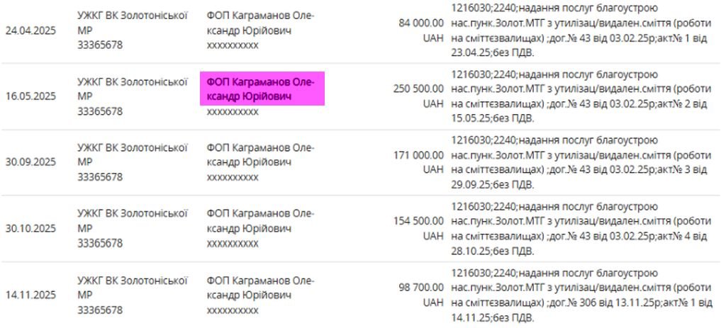 А ще є сміттєзвалище (про яке буде окрема частина публікації), яке обслуговує такий собі ФОП Каграманов Олександр Юрійович. Лише станом на сьогодні, за 2025 рік, Управління ЖКГ закачало туди 587 000 грн. наших з вами податків.