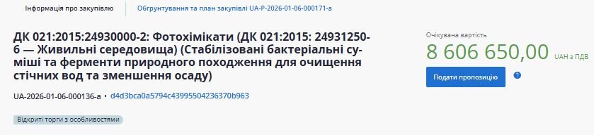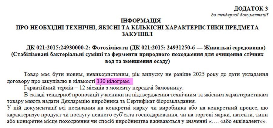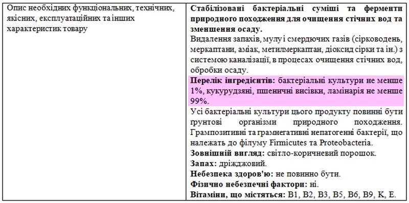 Відповідно до Додатка 3 тендерної документації, предметом закупівлі є стабілізовані бактеріальні суміші та ферменти природного походження для очищення стічних вод та зменшення осаду.