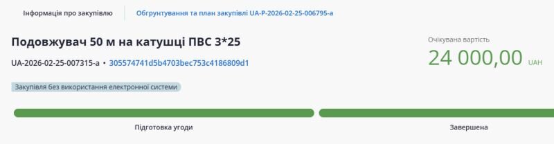 25 лютого 2026 року Виконавчий комітет Новодмитрівської сільської ради уклав прямий договір із ФОП Супрун Тетяна Олексіївна (зареєстрована за 100 км від громади у Смілянському районі). Предмет закупівлі - всього 4 подовжувачі на котушці.