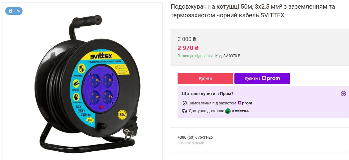Ми проаналізували ринок. Для прикладу, аналогічний професійний подовжувач відомого бренду з такими ж характеристиками (50 метрів, кабель 3х2.5 мм², заземлення, термозахист) у вільному доступі коштує 2 970 грн.